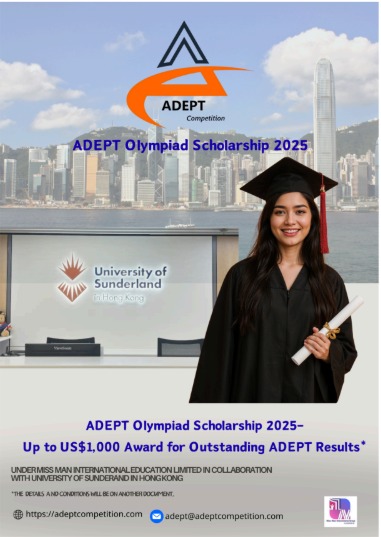 At present, this scholarship is exclusively available to students who have achieved excellence in the ADEPT Olympiad and have been admitted to eligible programmes at the University of Sunderland in Hong Kong (UoS HK). Priority is given to top performers in Business and English, though exceptional results in Chinese, Mathematics, Science, and Art are also recognised through Merit Awards.