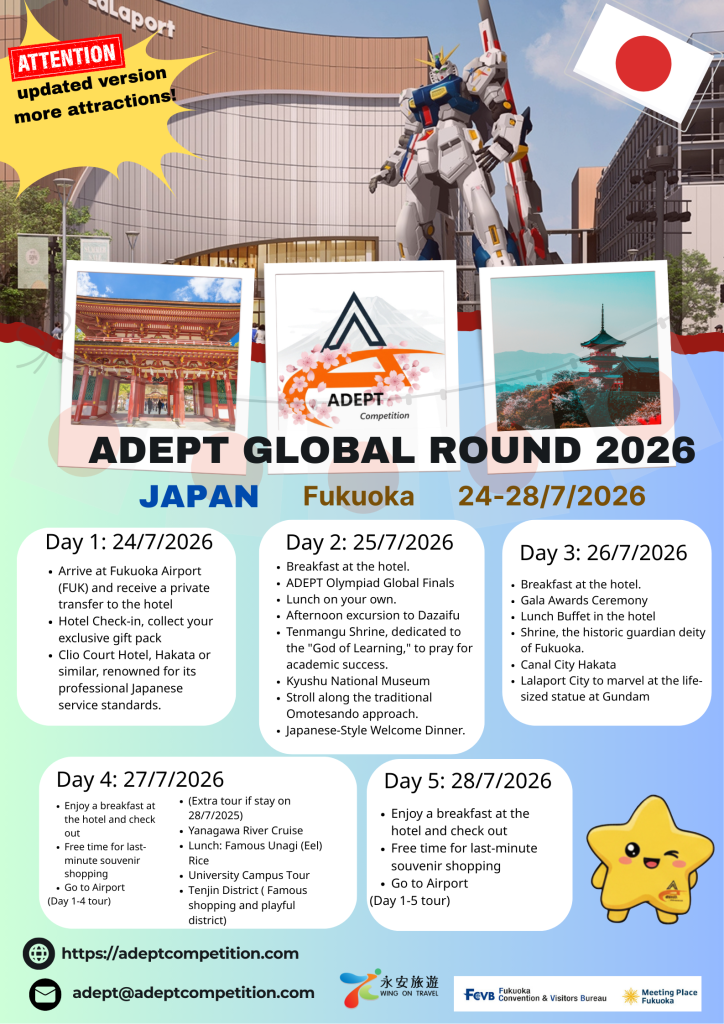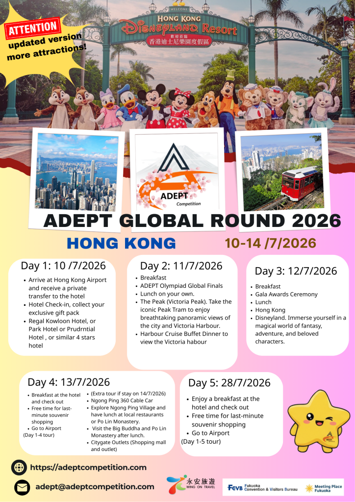 Welcome to the inaugural ADEPT Competition, an esteemed platform designed to showcase talent, creativity, and innovation on a global stage. Hosted in the vibrant city of Hong Kong/ Japan, this event promises to bring together aspiring individuals from diverse backgrounds and cultures to celebrate excellence in Chinese, English, Mathematics, Science, Digital Technology, AI & Cyber Security, Futurepreneurs (Business) and Art.